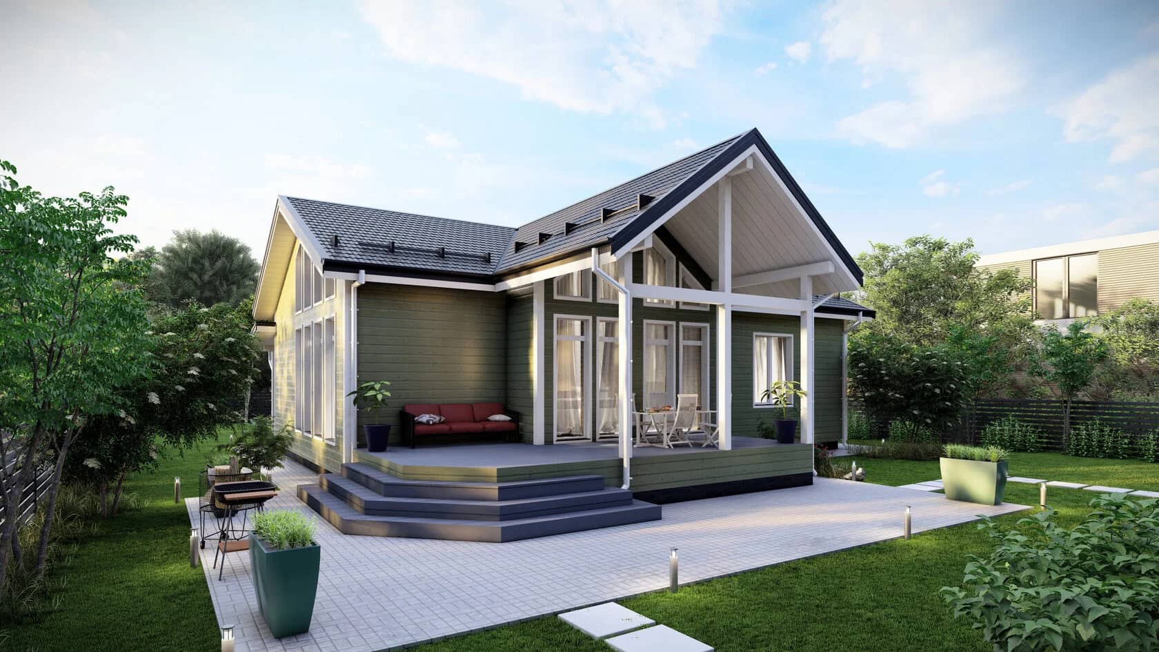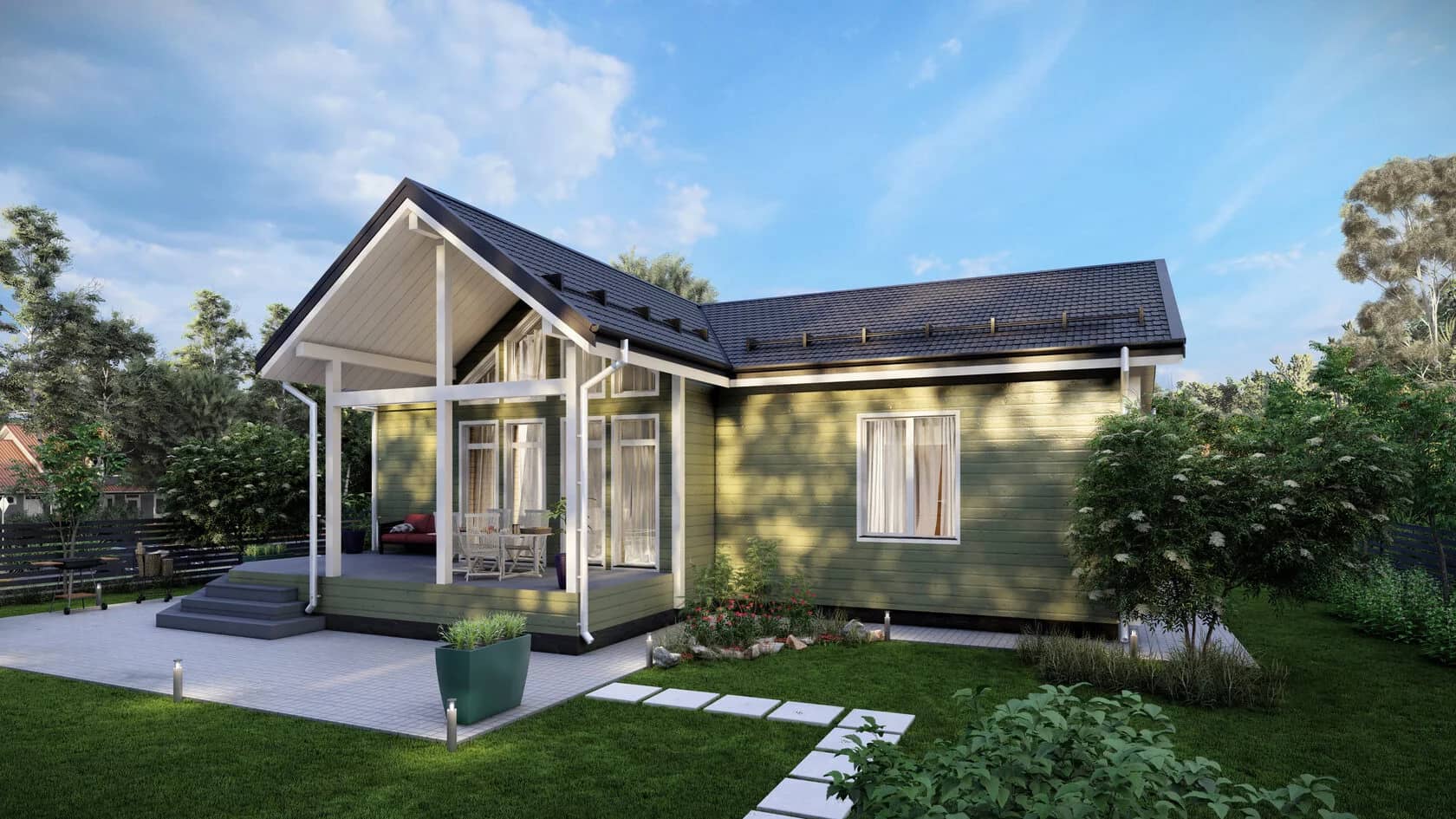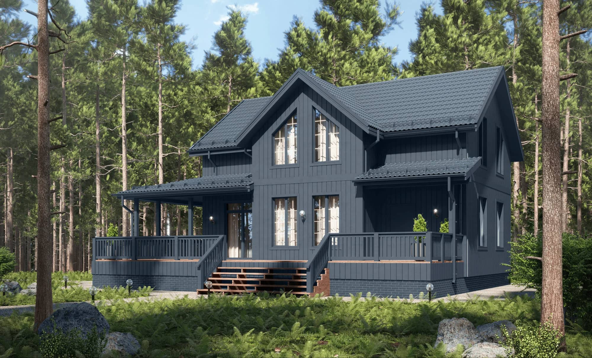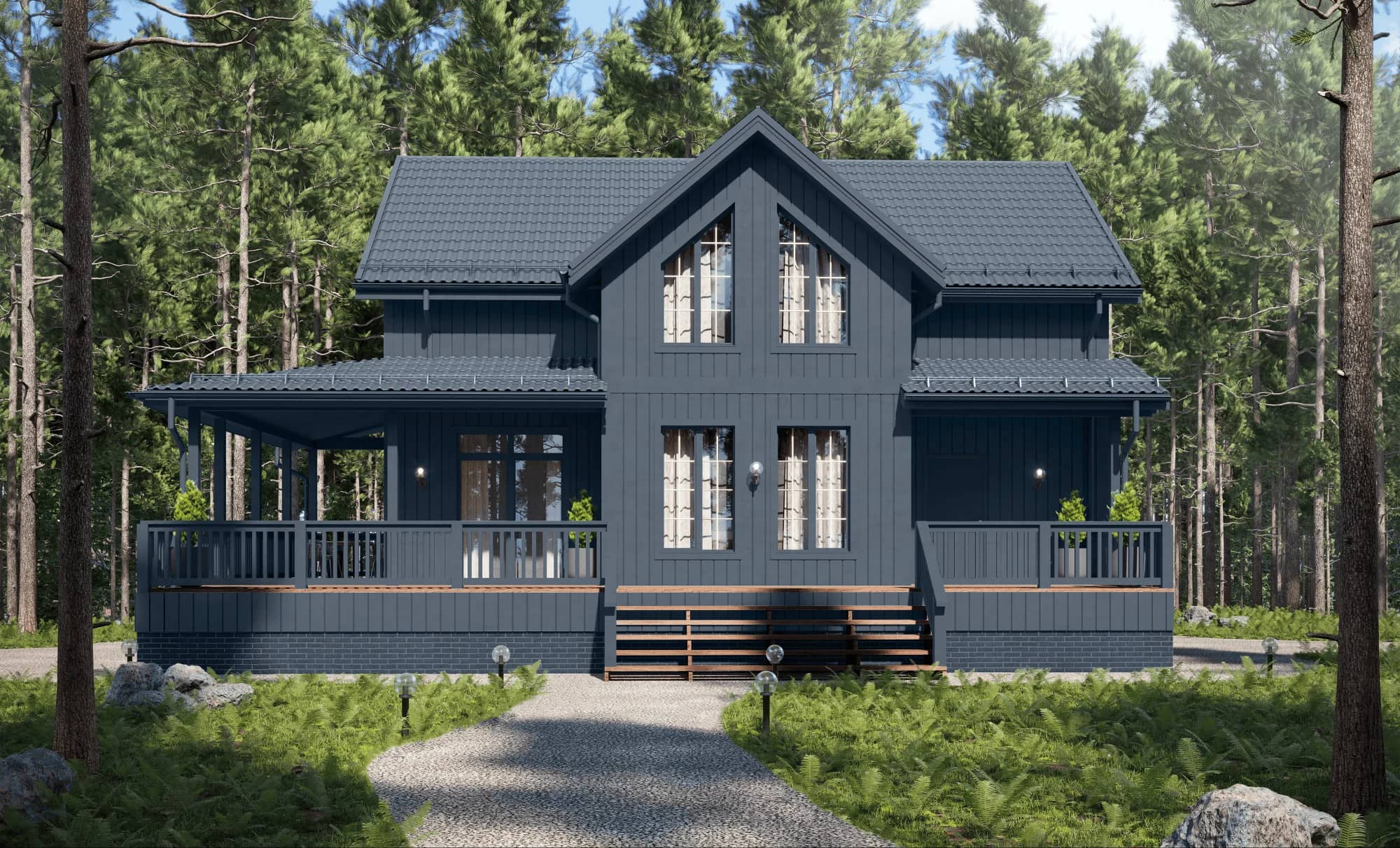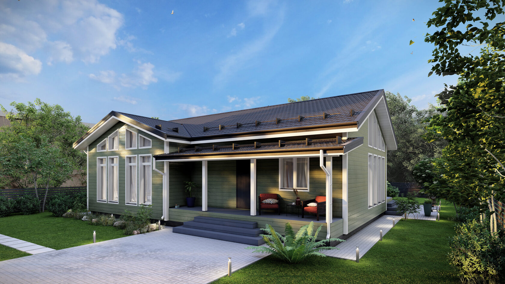 На первом плане массивная двухскатная крыша с большими свесами. Внутри светло и воздушно, так как много окон с каждой стороны фасада, есть второй свет и высокие потолки.