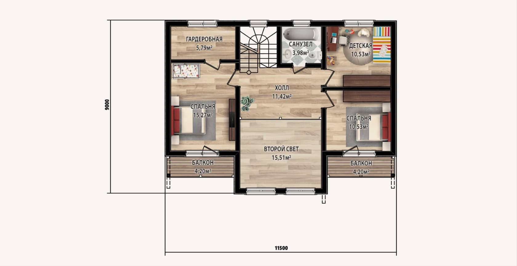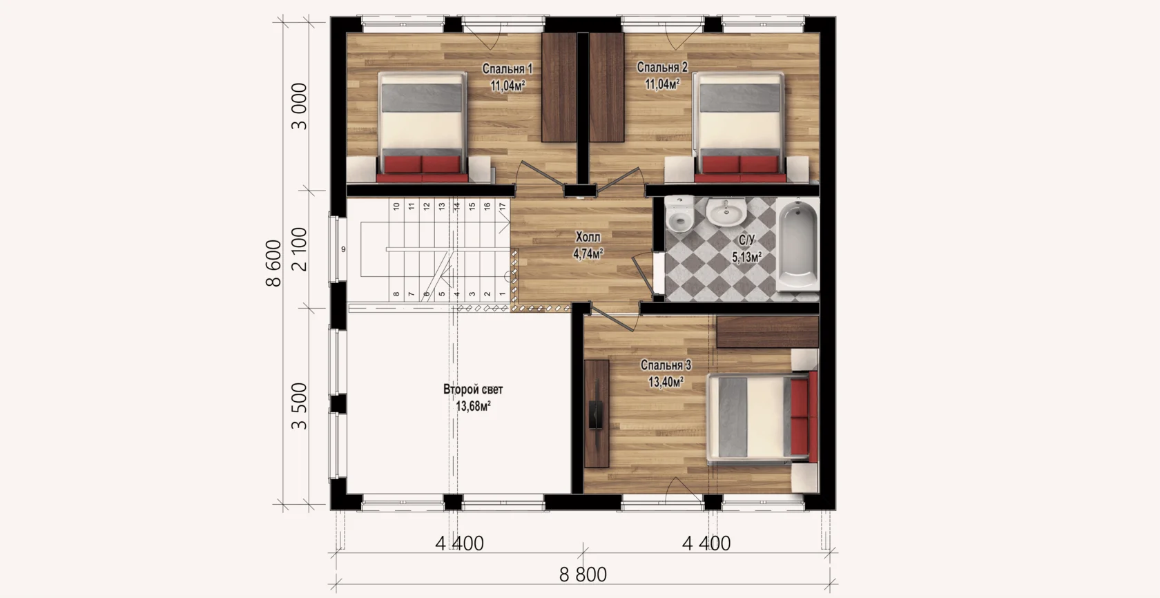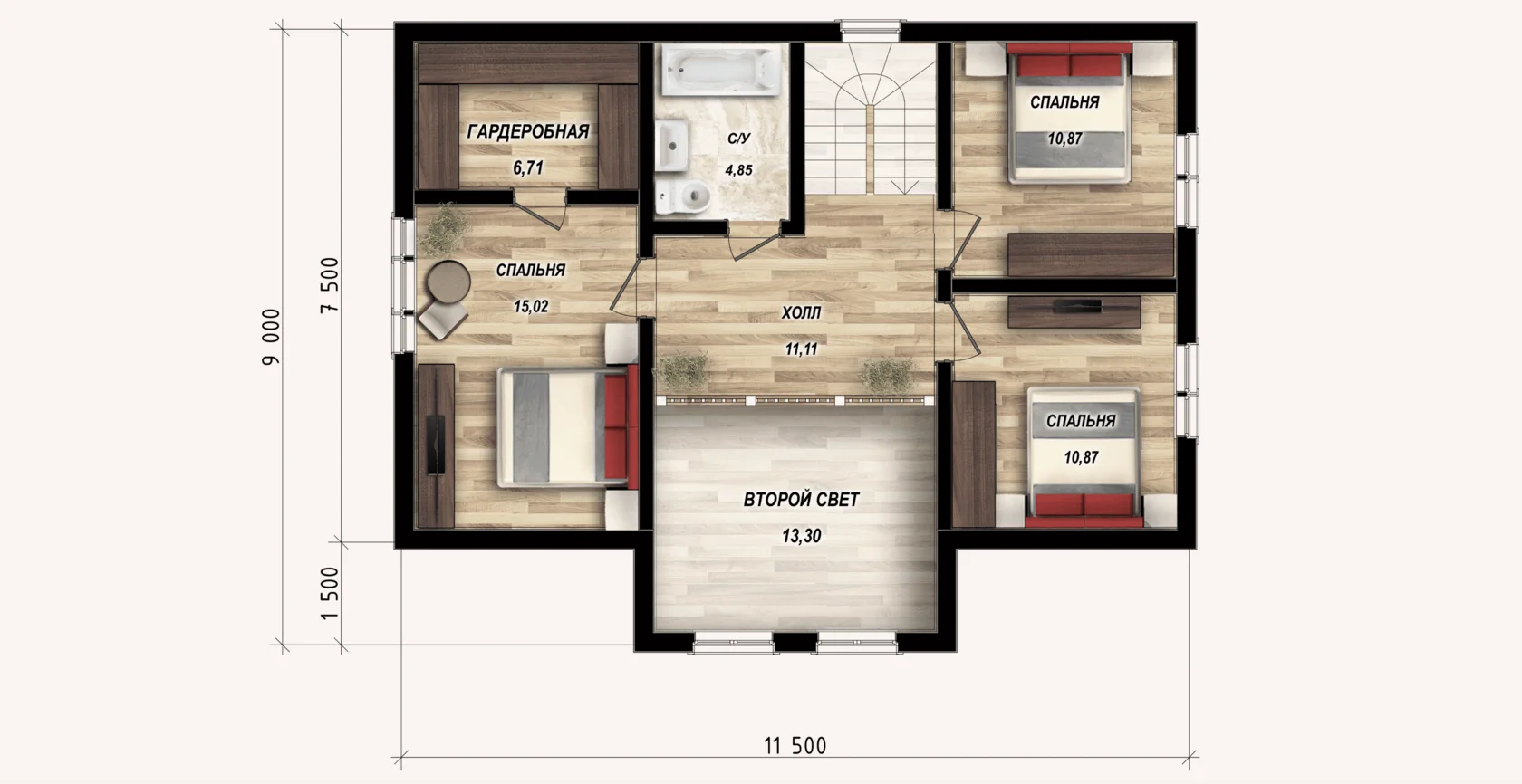 На втором: 3 спальни, санузел.