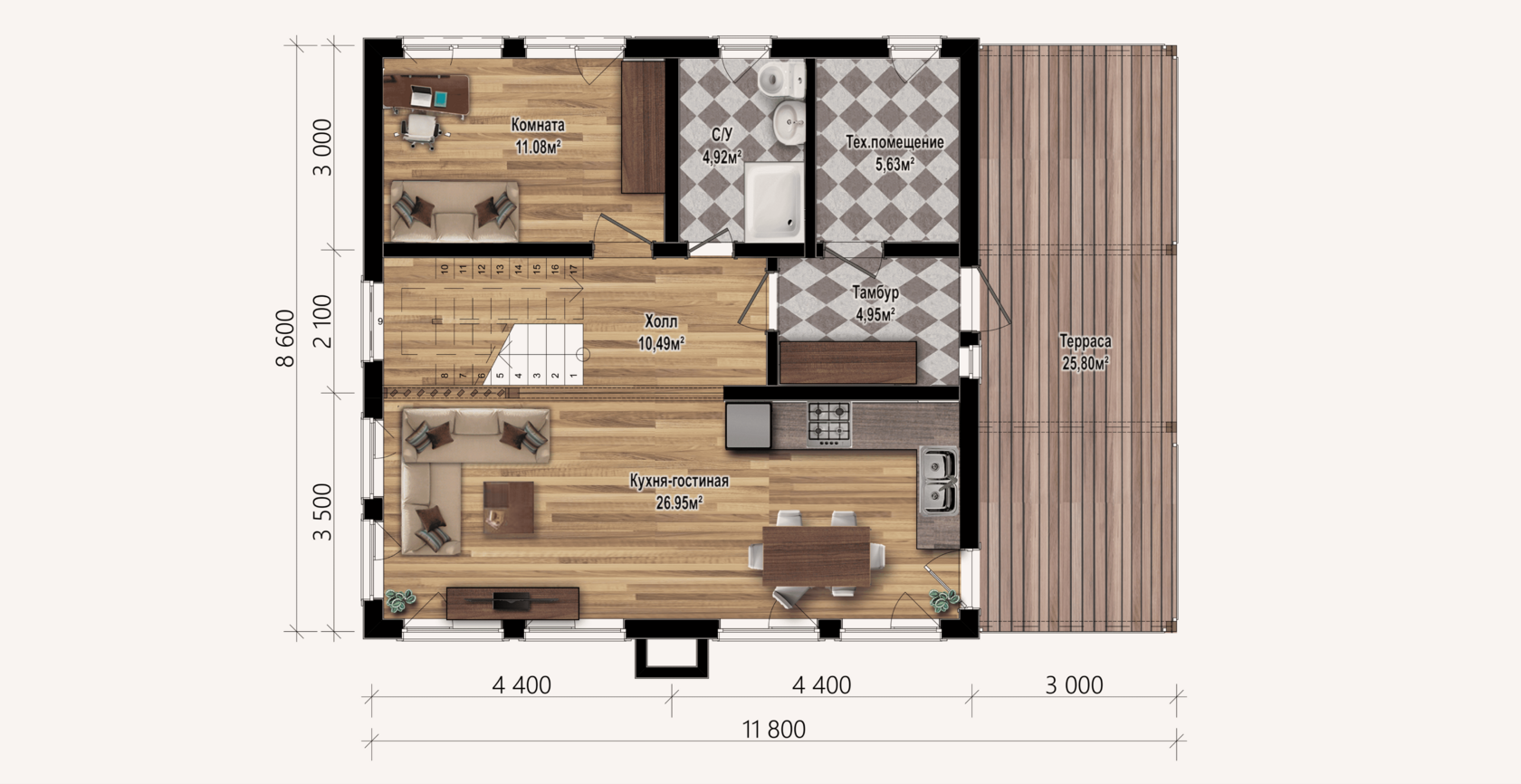 На первом этаже: кухня-гостиная 27 м², санузел, тамбур, холл и техническое помещение, отдельная комната под кабинет, библиотеку или игровой зал.