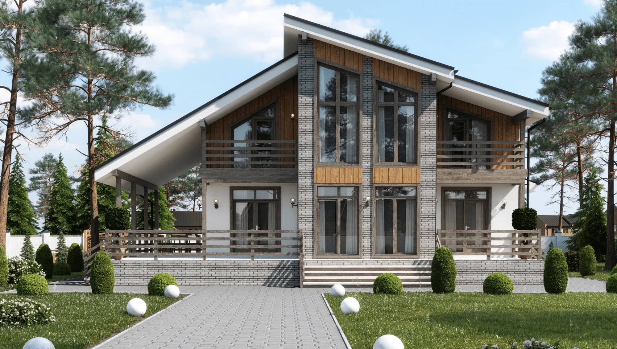 Отделка комбинированная из штукатурки, дерева и фиброцементных панелей, имитирующий кирпичную кладку.