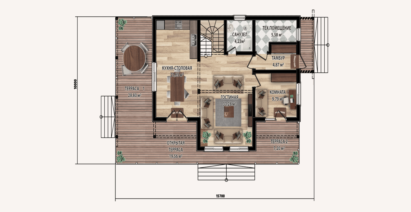 Размер дома: 15,7×10 м.